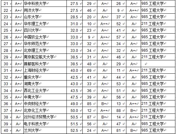 在本排行榜中,本科畢業生質量C級及以上的,列出排名和等級,C級以下的只列等級,不列排名。教師平均學術水平在B級及以上的,列出排名和等級,B級以下的只列等級,不列排名;新生錄取分數線(生源質量)在B級及以上的,列出排名和等級,B級以下的只列等級,不列排名。